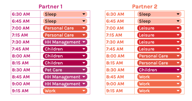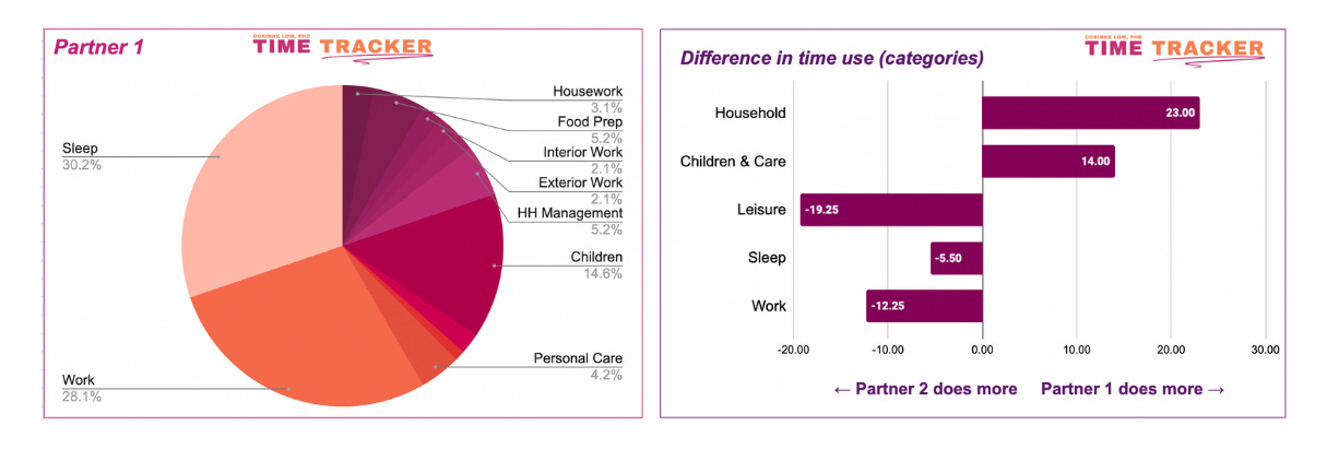 But you know what’s better than tracking your time alone? Tracking it with a partner. If you’re feeling squeezed on time, it might not just be about your own choices. And as much as you might be trying to communicate to your partner that things are hard, they might hear you in a different way when there’s a spreadsheet involved.